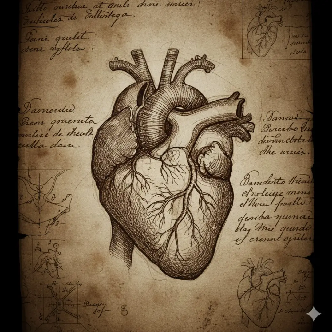 «Fotografía macro cinematográfica de un artefacto intelectual tangible. Un dibujo anatómico complejo realizado con tinta sepia oxidada aplicada con plumilla sobre pergamino animal grueso, fibroso y manchado por el tiempo. La técnica de sombreado ‘cross-hatching’ es obsesiva y densa, creando volumen físico a través de miles de líneas intersectadas. Anotaciones manuscritas cursivas urgentes y diagramas llenan los márgenes caóticamente, evidenciando un proceso mental febril. Iluminación rasante dramática que revela cada relieve de la tinta y la textura de la piel. 8k, photorealistic, high contrast, dark environment, –ar 9:16, –style raw»
