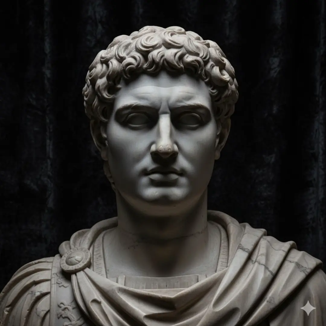 «Efigie romana clásica tallada en mármol de Carrara frío y cristalino, un monumento a la historia congelada. Iluminación cenital de museo severa y vertical que proyecta sombras negras profundas en los rasgos faciales, creando una expresión de estoicismo dramático. Contraste de texturas extremo: la suavidad pulida y las vetas sutiles de la piedra contra un fondo de nicho de terciopelo lujoso y oscuro que absorbe la luz. Atmósfera de silencio solemne y reverencia artística. 8k, photorealistic, high contrast, dark environment, –ar 9:16, –style raw»