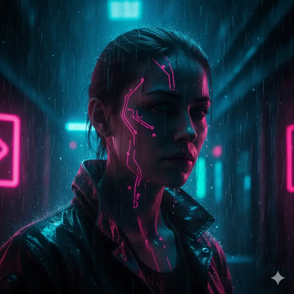 «Retrato cinematográfico de noir distópico sumergido en una lluvia implacable. La iluminación proviene de reflejos fracturados de neón saturado—azules eléctricos, magentas ácidos y verdes tóxicos—rebotando en superficies urbanas mojadas, vidrio y el rostro del sujeto. Patrones de circuitos bioluminiscentes subdérmicos integrados brillan con un pulso interno intenso a través de la piel empapada, una fusión melancólica de carne humana y tecnología. Vapor atmosférico denso, texturas de ropa impermeable reflectante y sombras profundas que consumen el entorno. Estética ciberpunk visceral. 8k, photorealistic, high contrast, dark environment, –ar 9:16, –style raw»