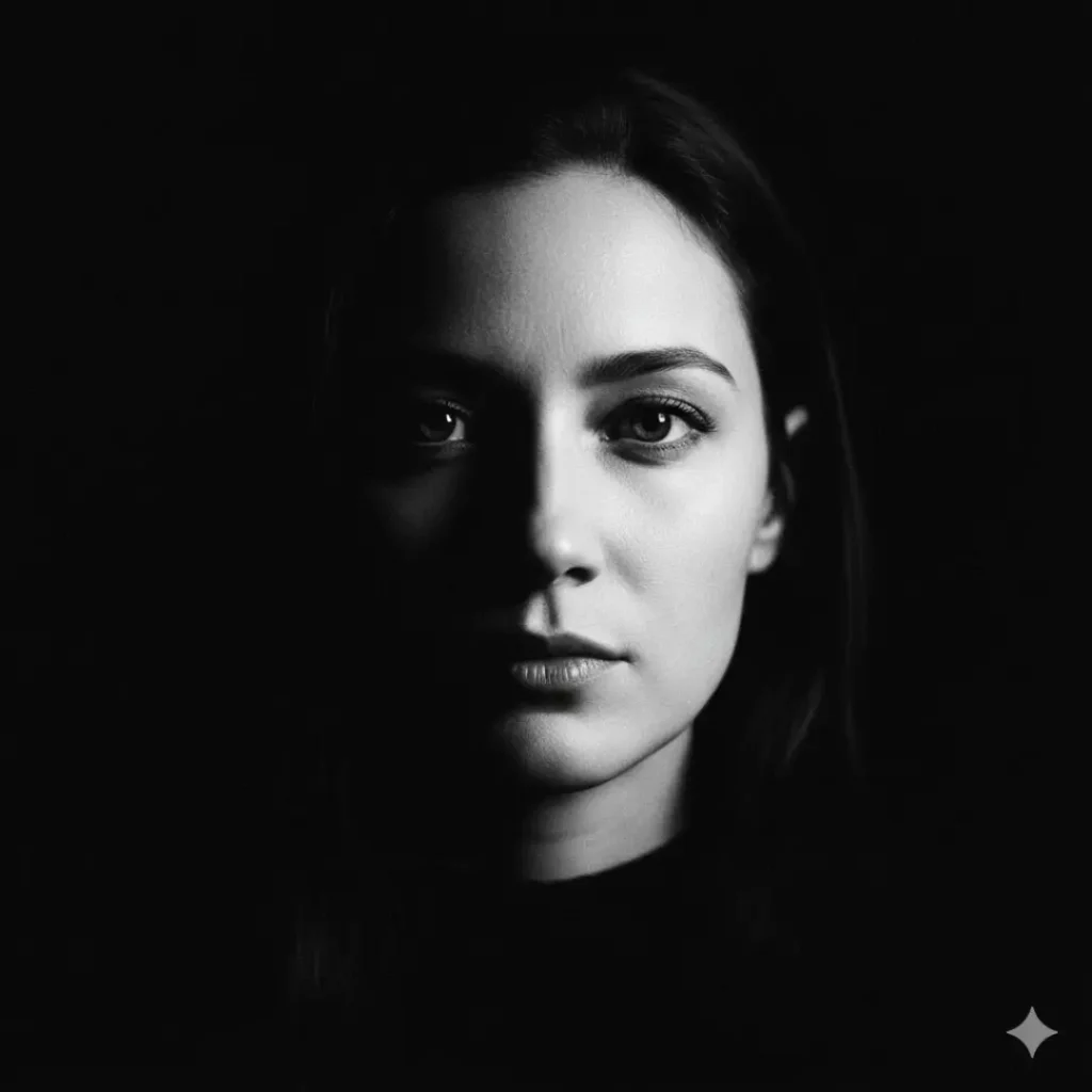 «Retrato cinematográfico monocromático con cruda potencia emotiva, evocando la estética de Peter Lindbergh. Iluminación lateral de claroscuro extremo y cortante que esculpe la estructura facial, dividiendo al sujeto entre luz cegadora y sombra impenetrable. Fondo de vacío negro infinito y minimalista. Grano de película de 35mm pesado y tangible, realismo sin disculpas, textura analógica profunda. Una revelación descarnada del carácter. 8k, photorealistic, high contrast, dark environment, –ar 9:16, –style raw»