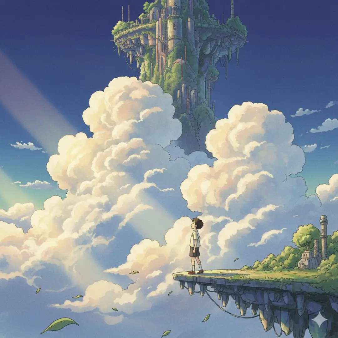 «Retrato ilustrativo ambiental al estilo icónico del Studio Ghibli, fusionando la animación tradicional cel-shading con una calidad de textura tangible. El sujeto es un personaje juvenil capturado en una wide shot que revela el ambiente vasto. La técnica emula líneas de lápiz finas y precisas, y una paleta de pigmentos de acuarela vibrantes pero suaves (colores pastel o saturados de mañana). El fondo está dominado por inmensas nubes cumulonimbus flotantes, pintadas con detalle meticuloso, que enmarcan una torre onírica que se extiende hacia un cielo azul pálido. La iluminación es mágica y etérea, simulando la golden hour suave; un sutil rim light mágico baña al sujeto y las cimas de las nubes. Los rayos de luz (shafts of light o god rays) penetran la escena con delicadeza, creando una sensación de global illumination nostálgica y profunda. Se enfatiza el depth of field para dar profundidad a la escena y la sensación de un mundo vivo y detallado. Studio Ghibli style, ultra hyperdetailed, 8k, photorealistic render of 2D art, soft contrast, nostalgic and dreamlike atmosphere, style raw.»