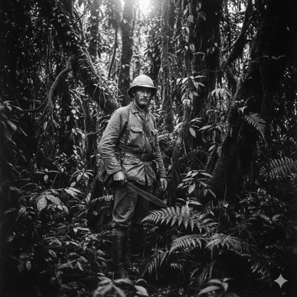 «Artefacto visual crudo y visceral de la exploración de principios del siglo XX. Una fotografía monocromática de archivo recuperada, con grano de película extremadamente grueso y palpable. Un explorador de National Geographic de 1920, curtido por la intemperie—casco de corcho, lona manchada de sudor, equipo de cuero pesado y machete—es casi consumido por una pared impenetrable y caótica de flora selvática antigua. Iluminación natural de claroscuro dramático donde la luz solar moteada lucha por atravesar el dosel denso, creando charcos de luz dura y sombras abisales. Textura de impresión de gelatina de plata envejecida. 8k, photorealistic, high contrast, dark environment, –ar 9:16, –style raw»