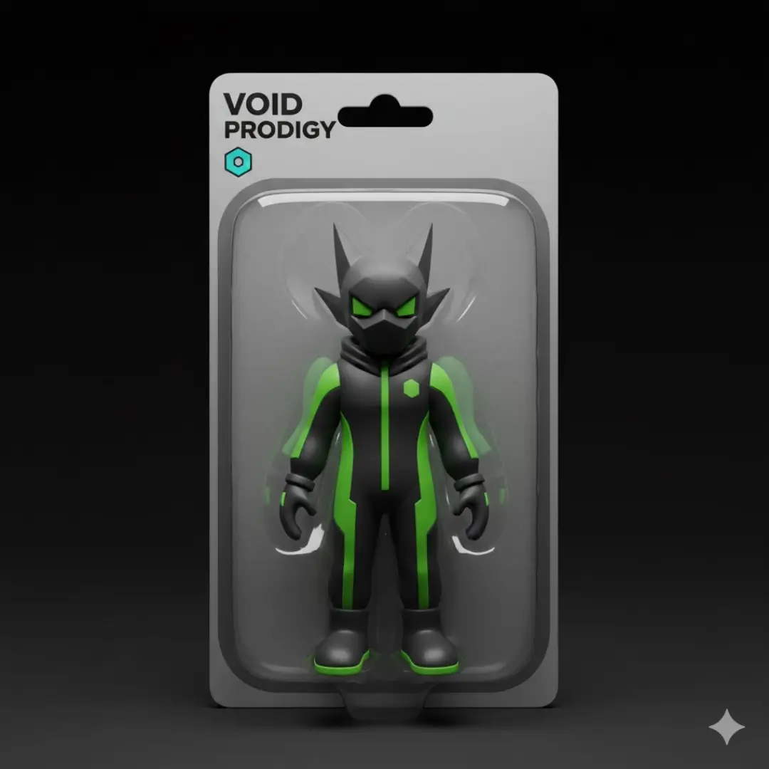 «Cinematografía de producto de alta gama capturando una figura de arte de vinilo prístina encapsulada dentro de su empaque de blíster de condición menta. Un estudio en texturas sintéticas: el acabado mate de la figura esculpida contrastado nítidamente contra la ventana de acetato brillante y altamente reflectante, que muestra reflejos especulares y distorsiones menores. La tipografía y los elementos de marca en el recinto de cartón satinado son nítidos y legibles. Iluminación de estudio controlada dramática contra un vacío oscuro y estéril. 8k, photorealistic, high contrast, dark environment, –ar 9:16, –style raw»