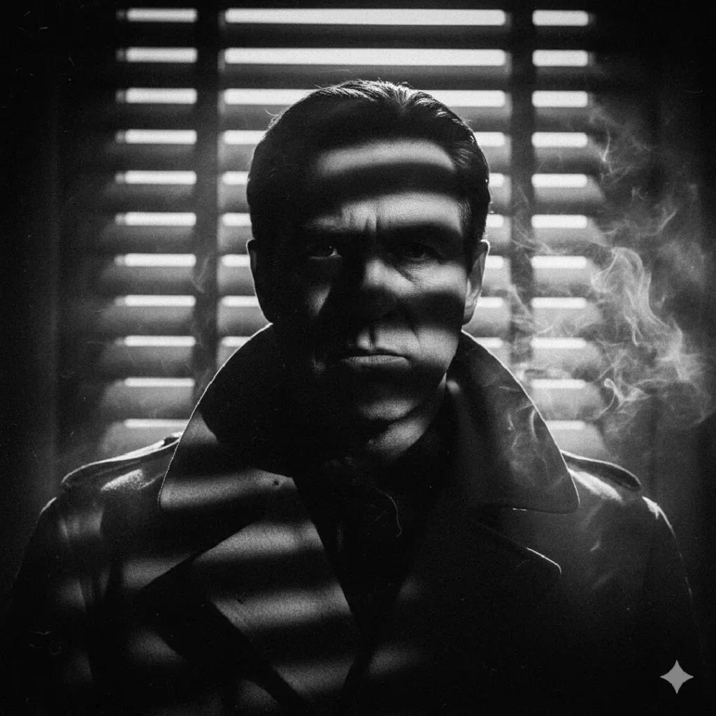 «Un fotograma esencial del cine negro (Film Noir) más crudo y endurecido. Retrato monocromático donde haces de luz nítidos y cortantes atraviesan persianas venecianas, proyectando un patrón de rejas de prisión de sombra y luz sobre un rostro cansado del mundo, ocultando los ojos. Una gabardina de lana arrugada envuelta en la penumbra. Humo de cigarrillo volumétrico y denso se riza en el aire, retroiluminado y atrapando las astillas de luz. Grano de película, negros profundos como la tinta y blancos quemados. Atmósfera claustrofóbica. 8k, photorealistic, high contrast, dark environment, –ar 9:16, –style raw»
