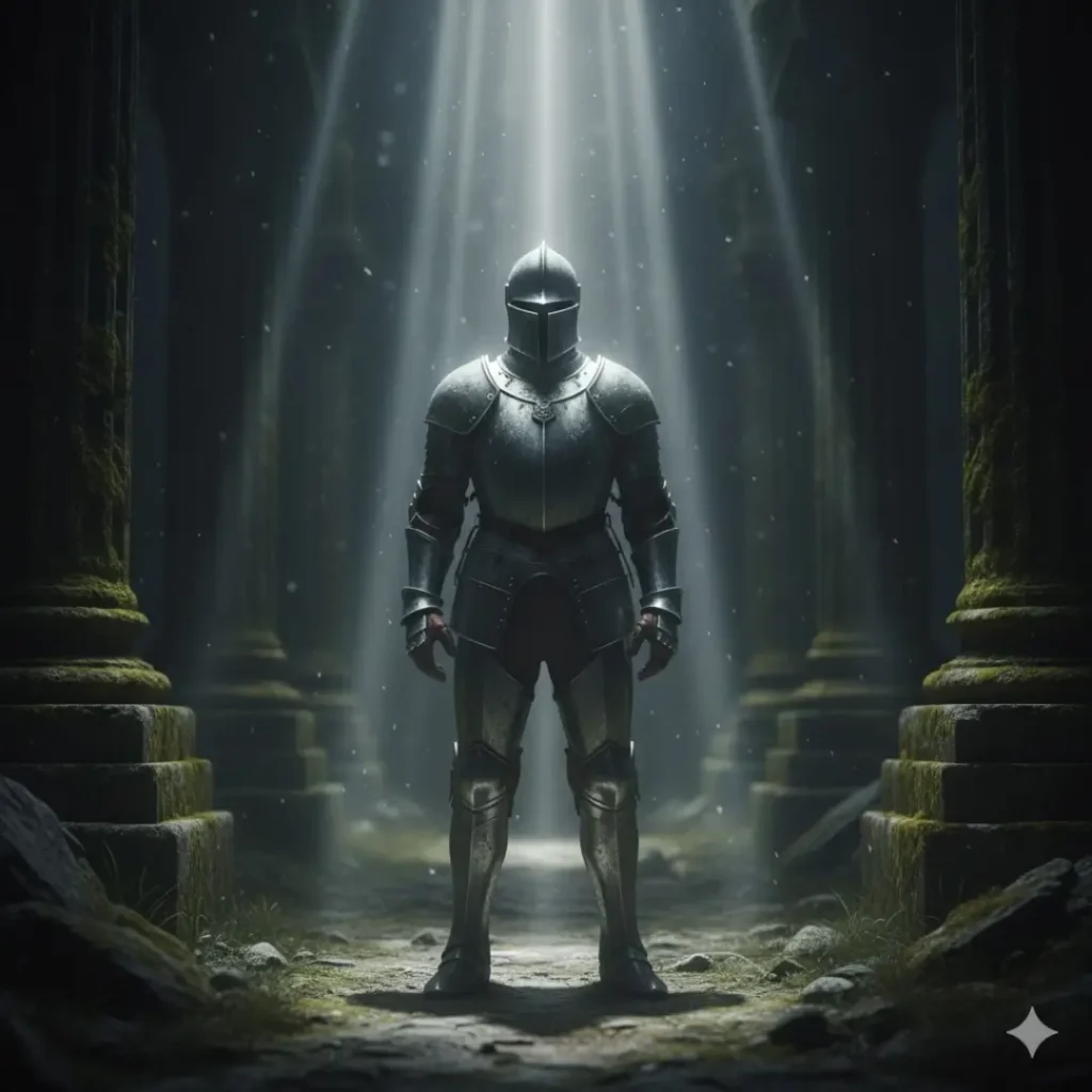 «Una interpretación fotorrealista de la heroicidad de la alta fantasía, traduciendo la estética de Dungeons & Dragons a una realidad tangible. Un guerrero solitario vestido con una armadura de placas plateadas pulidas y desgastadas por la batalla actúa como un faro en medio de ruinas antiguas y tenebrosas. Masivos haces volumétricos de luz divina (god rays) atraviesan la penumbra desde arriba, rompiendo la oscuridad y golpeando la armadura con intensidad celestial, creando reflejos especulares cegadores. Una metáfora visual del destino y el poder sagrado cortando el caos. Texturas de metal pesado, piedra antigua y atmósfera densa. 8k, photorealistic, high contrast, dark environment, –ar 9:16, –style raw»