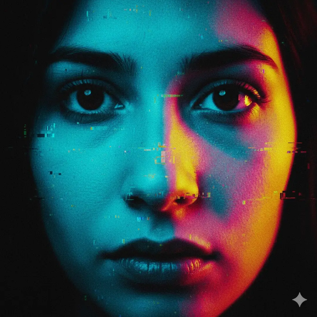 «Retrato fotográfico conceptual que reinterpreta la estética de 16-bits de SNES como una realidad física tangible. Un primer plano extremo donde las sombras se forman mediante un patrón de tramado (dithering) de alta resolución, no como píxeles planos, sino como textura de luz fragmentada. Iluminación dramática y saturada utilizando una paleta restringida y vibrante de neones cian, magenta y amarillo eléctrico que chocan contra negros profundos. Textura visible de líneas de escaneo CRT y brillo fosforescente, una reliquia digital vista con lente macro analógica. 8k, photorealistic, high contrast, dark environment, –ar 9:16, –style raw»